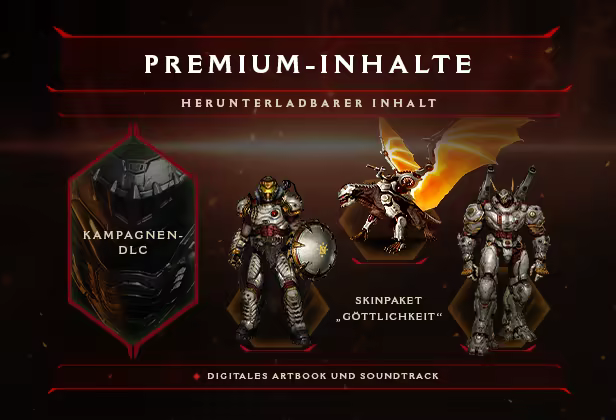 Kämpfe standhaft dank Premium-Upgrade* inklusive Kampagnen-DLC**, dem digitalem Artbook und dem Soundtrack sowie dem Skinpaket „Göttlichkeit“, das passende Skins für den DOOM-Slayer, den Drachen und den Atlan enthält.