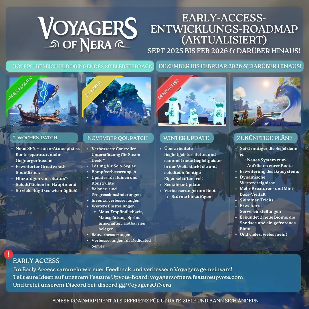 Wir sind überzeugt: Wirklich Großartige Spiele entstehen gemeinsam mit der Community. Seit Mitte 2025 testen wir Voyagers of Nera alle zwei Wochen – jetzt möchten wir mit euch den nächsten Schritt gehen. Durch den Early Access können wir euer Feedback in noch größerem Umfang ins Spiel einfließen lassen und Nera stetig weiterentwickeln. Teilt eure Meinung über unsere Umfrage im Spiel, auf Steam oder Discord! Ein riesiges Dankeschön an alle, die uns schon jetzt unterstützen und dabei helfen, diese Welt und ihre Geister zum Leben zu erwecken!
