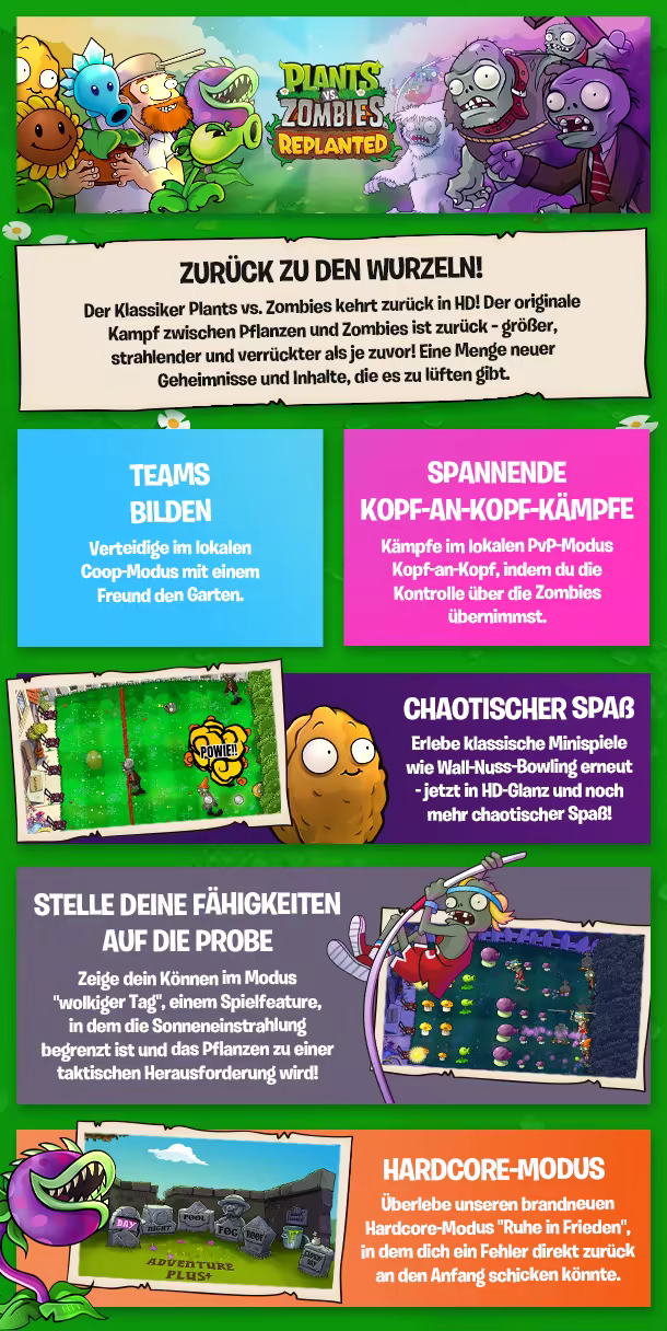 Spiele die epischen Hinterhofschlachten von damals und entdecke völlig neue Level und Überraschungen. Das sind 15 Jahre Spielgeschichte, jederzeit zum Greifen nah. Kehre zurück in die glorreichen Tage, in denen Erbsenkanonen und Sonnenblumen gegen Hirn-hungrige Chaoten bestehen mussten. Schließ dich dem ultimativen Garten-Verteidigungstrupp an und erlebe den Gartenkrieg neu.