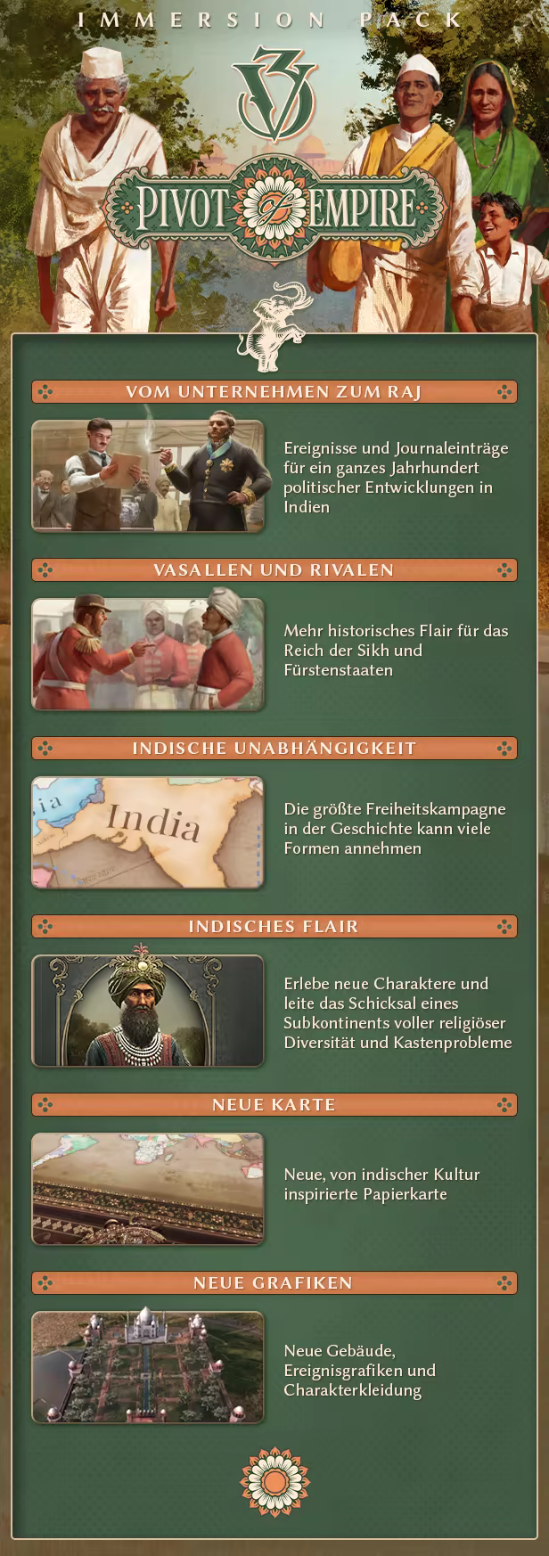 Pivot of Empire legt den Schwerpunkt auf die gesellschaftliche Entwicklung in Indien in dieser Periode – von der Regierung durch ein Privatunternehmen bis zu den Anfängen einer Unabhängigkeitsbewegung. Führe die vielfältigen Kulturen des indischen Subkontinents zu Wohlstand und eventuell sogar zur Freiheit, während die Stürme des Wandels das Juwel der Krone umbrausen. Führe die Völker Indiens zur Selbstherrschaft und einem globalen Schicksal, oder bewahre den Status quo als Herzstück des mächtigsten Imperiums der Welt.