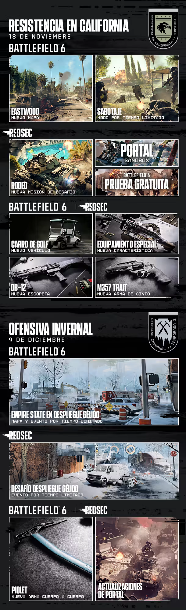 La temporada 1 se despliega en 3 fases: primero con Operaciones rebeldes, luego Resistencia en California y Ofensiva invernal, cada una llena de hardware militar temático clasificado, dispositivos de última generación, nuevos mapas y armas de poder sin precedentes. Cada mes se añade nuevo contenido que está disponible de inmediato para una personalización casi ilimitada en Portal.