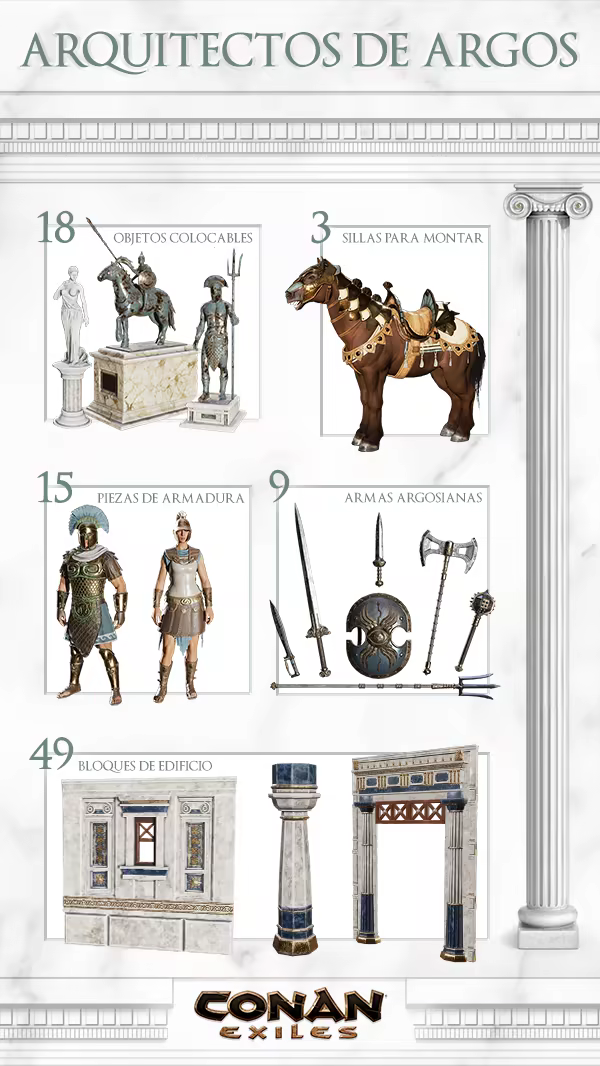 Construye ciudades impactantes y templos de lustroso mármol blanco con el pack Arquitectos de Argos. ¡Decora tu base con elegantes estatuas y fuentes refrescantes para que quede mejor que nunca!