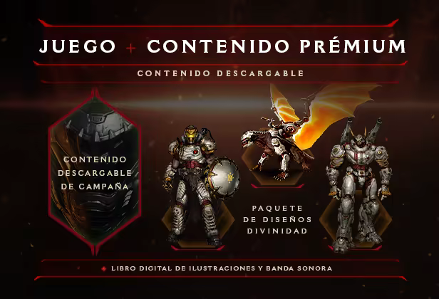 Resiste las acometidas y lucha con la Edición Prémium, que incluye el contenido descargable de la campaña*, el libro digital de ilustraciones, la banda sonora y el paquete de diseños Divinidad con diseños a juego para el DOOM Slayer, el dragón y el Atlan.