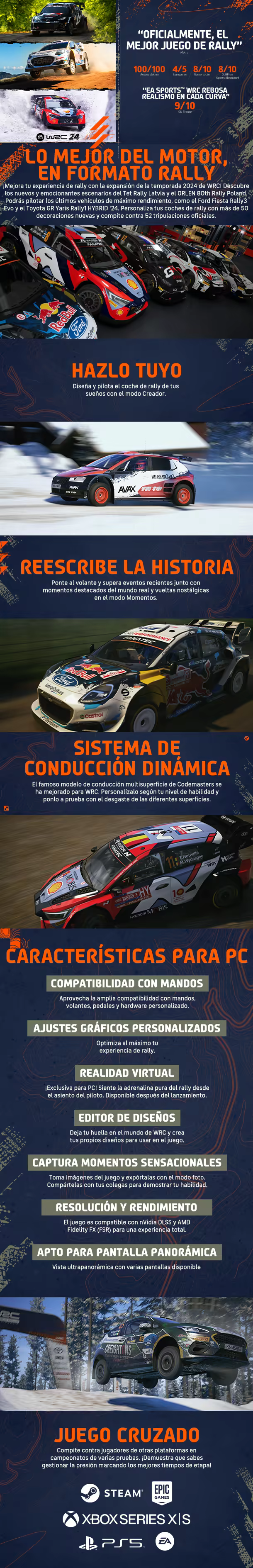 ¡Crea el coche de tus sueños en nuestro juego de rally más grande hasta la fecha! EA SPORTS™ WRC es el nuevo videojuego oficial del FIA World Rally Championship y el primero desarrollado por el galardonado equipo responsable de la serie DiRT Rally.