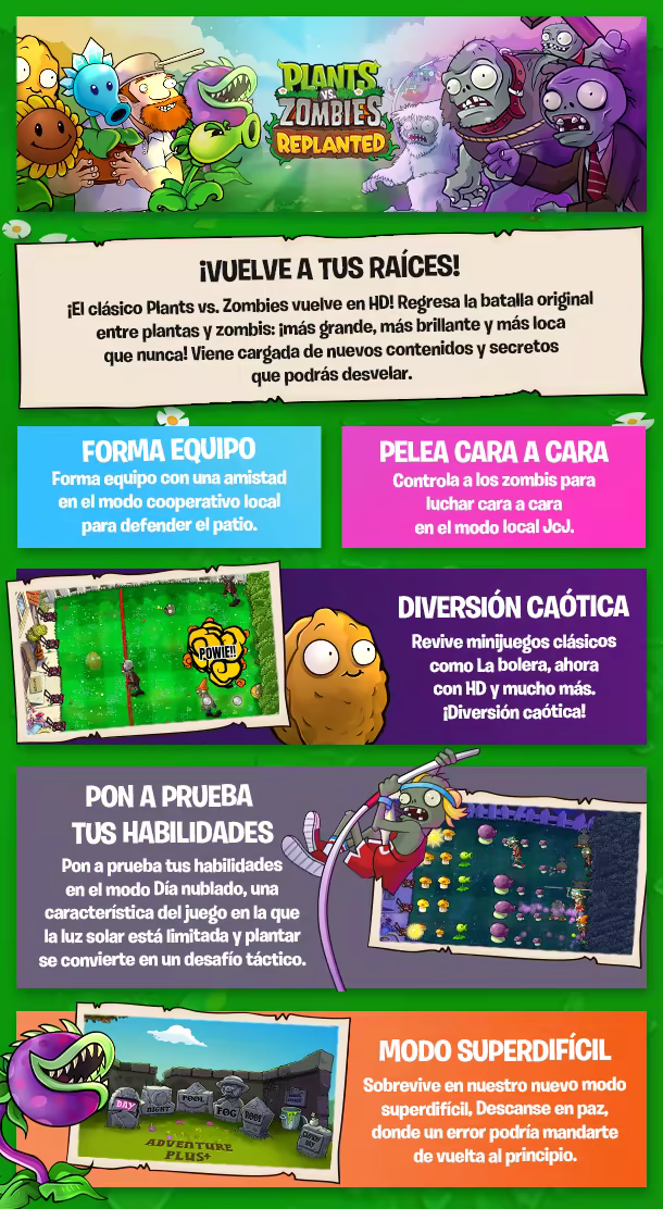 Vuelve a visitar esos enfrentamientos épicos en el patio que recuerdas, pero esta vez con nuevos niveles, giros novedosos y 15 años de historia inédita de la franquicia a tu alcance. ¡Revive los días gloriosos de lanzaguisantes, girasoles y caos devoracerebros! Vuelve a unirte a la defensa del patio definitiva y vive la gresca que dio origen al fenómeno... ¡y que ahora regresa para una nueva era!