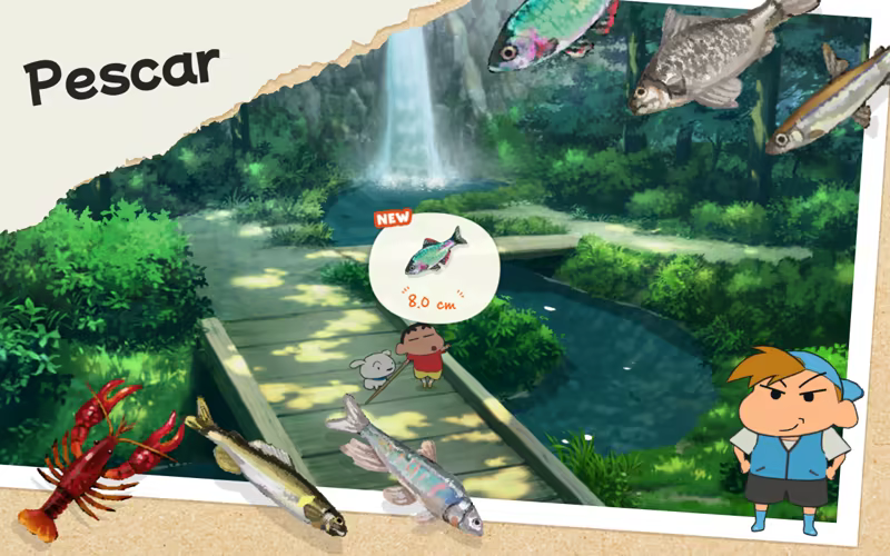 Los trabajadores se toman un respiro en el restaurante de la ciudad. ¡Ayuda a la dueña a crear nuevos menús deliciosos y únicos! Para ello, puedes usar el pescado que capture Shin Chan y los ingredientes que recolecte.