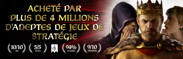 Votre héritage vous attend. Choisissez une maison noble et guidez votre dynastie vers la grandeur sur des générations, dans un Moyen Âge épique. La guerre n'est qu'un des moyens d'établir votre règne. La vraie stratégie requiert des talents diplomatiques affutés, la maîtrise de votre royaume et de la ruse. Crusader Kings III prolonge la série populaire de Paradox Development Studio, avec son mariage acclamé de grande stratégie immersive et de jeu de rôle médiéval profond.