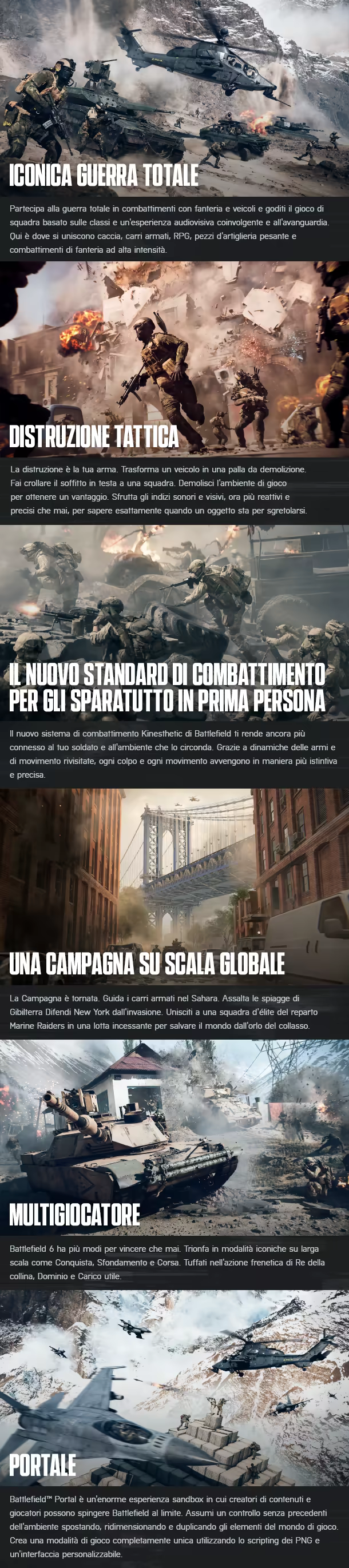 L'esperienza di guerra totale suprema. Combatti in scontri di fanteria ad alta intensità. Squarcia i cieli negli scontri aerei. Demolisci l'ambiente circostante per ottenere un vantaggio strategico. Sfrutta il controllo totale su ogni azione e movimento usando il sistema di combattimento Kinesthetic. In una guerra di carri armati, caccia e giganteschi arsenali, l'arma più letale è la tua squadra. Questo è Battlefield 6.