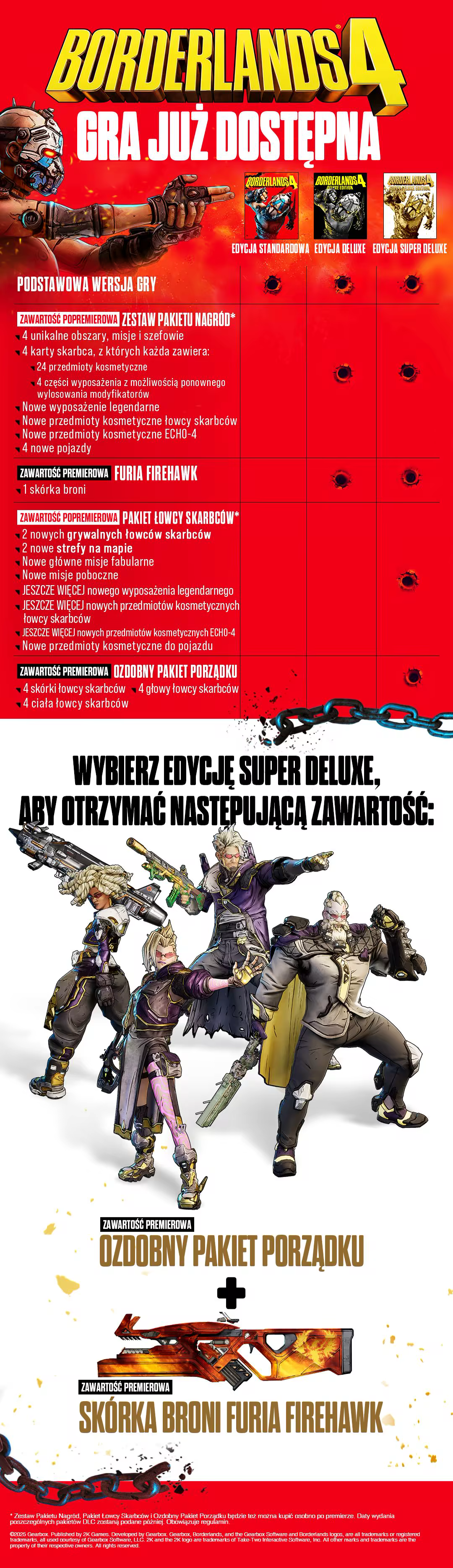 ** Pakiet Łowcy Skarbców Borderlands 4 składa się z 2 oddzielnych pakietów DLC dostępnych po premierze gry. Pakiet Łowcy Skarbców jest dołączony do Borderlands 4 Super Deluxe Edition. Pakiet Łowcy Skarbców i poszczególne pakiety DLC, które wchodzą w jego skład, będzie można również kupić osobno w momencie premiery (wymagana podstawowa wersja gry). Dokładny czas premiery każdego pakietu DLC zostanie ogłoszony w późniejszym terminie i może ulec zmianie. Obowiązuje regulamin.