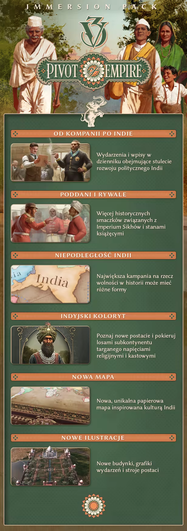Pivot of Empire skupia się na rozwoju społecznym Indii w tym okresie, od administracji rządowej poprzez prywatne przedsiębiorstwa aż po początki ruchów niepodległościowych. Wskaż zróżnicowanym kulturom subkontynentu indyjskiego drogę do dobrobytu i, potencjalnie, wolności w czasie, gdy wokół klejnotu korony wiruje fala zmian. Poprowadź mieszkańców Indii do autonomii i zadecyduj o ich globalnym przeznaczeniu lub utrzymaj status quo, zachowując pozycję kraju jako chluby najpotężniejszego imperium na świecie.