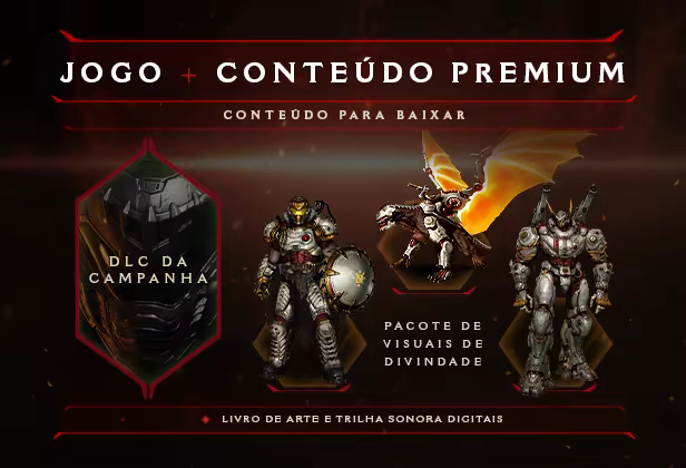 Entre na Luta com a Edição Premium, que inclui o DLC da campanha*, o Livro de Arte e a Trilha Sonora Digitais e o Pacote de Visuais de Divindade, que inclui visuais correspondentes para DOOM Slayer, o dragão e Atlan.