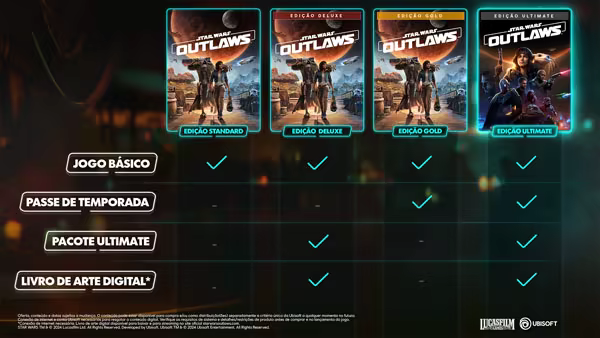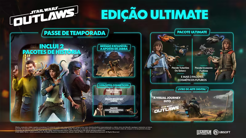 Tenha acesso ao jogo, ao passe de temporada, ao pacote Ultimate e a um livro de arte digital com a Edição Ultimate de Star Wars Outlaws.*