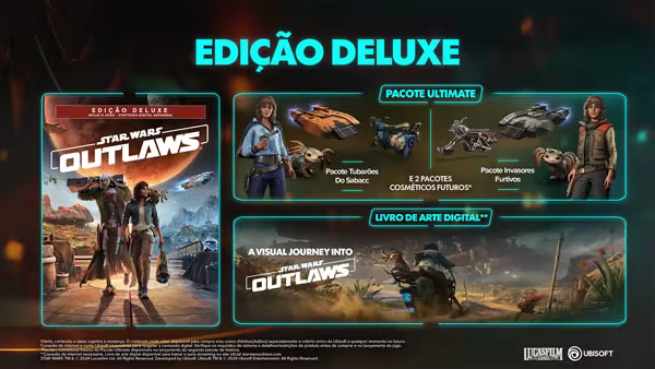Tenha acesso ao jogo, a um livro de arte digital e ao pacote Ultimate com a Edição Deluxe de Star Wars Outlaws, que inclui: