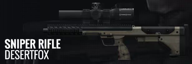 Sniper Rifle - Desertfox – The Desertfox, is a high powered Sniper Rifle. Originally designed for desert combat, it wields remarkably well in urban environments. The bullpup design and steady handling makes it a perfect fit on each assassin’s long range gun rack.