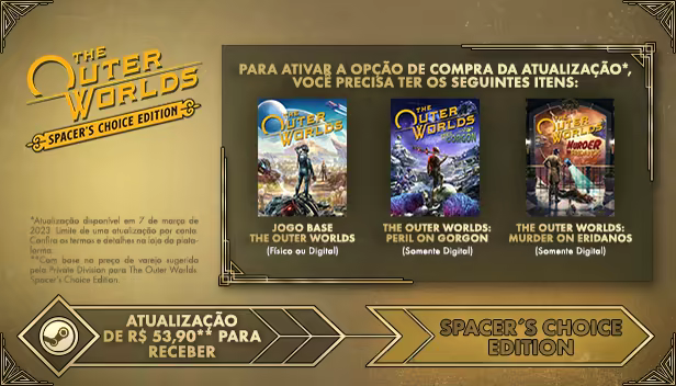 Jogadores que já possuem The Outer Worlds e os DLCs vinculados Murder on Eridanos e Peril on Gorgon no Steam podem realizar uma atualização e obter The Outer Worlds: Spacer’s Choice Edition por um preço de compra reduzido.* Para ativar a opção de compra da atualização, os jogadores devem iniciar uma sessão no Steam com a mesma conta usada para comprar o jogo base e os DLCs vinculados e selecionar a opção de compra "Completar o Pacote".