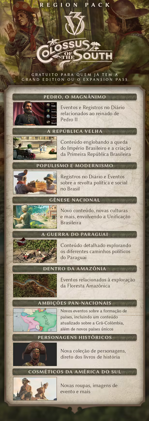 Rica em povos, culturas e recursos, a América do Sul entra na Era Vitoriana com diversas vantagens. Mas muitos desafios esperam por estas nações recém-libertas da dominação europeia. Abra o seu caminho para o futuro do Hemisfério Sul com Colossus of the South, o novo pacote de região para Victoria 3.