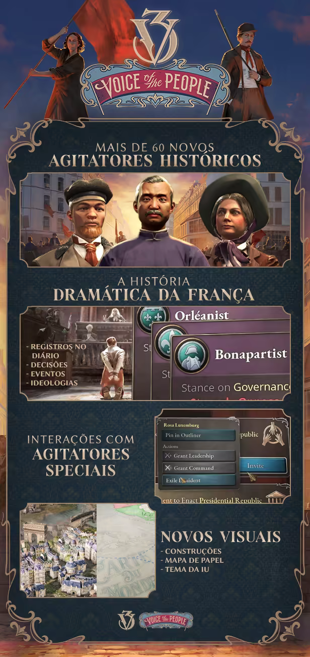 Reviva os eventos políticos dramáticos do século XIX no primeiro pacote de imersão de Victoria 3. Inspirando-se nos conflitos históricos entre reformistas, reacionários e revolucionários, Voice of the People leva você ao centro de uma crise política enquanto personagens carismáticos da história impõem vigorosamente suas próprias visões.