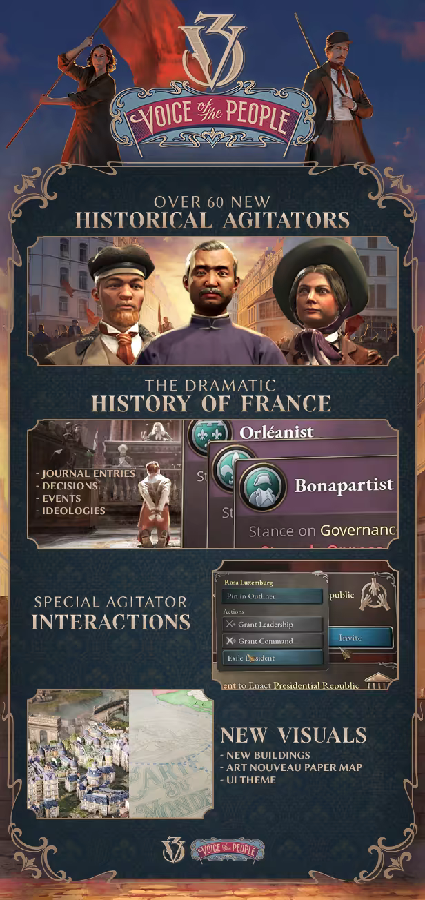 Relive the dramatic political events of the 19th century in this first immersion pack for Victoria 3. Drawing from the historical struggles between reformists, reactionaries and revolutionaries, Voice of the People puts you in the middle of political crises as charismatic characters from history vigorously push their agendas.
