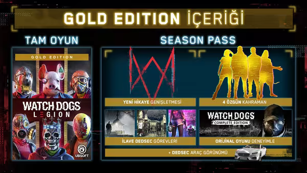 Gold Sürüm'de sezon kartı bulunuyor. Sezon kartı kapsamında iki bölümden oluşan bir genişletme paketi, ekstra görevler, dört efsanevi karakter ve Orijinal Watch Dogs Complete Edition bulunuyor.