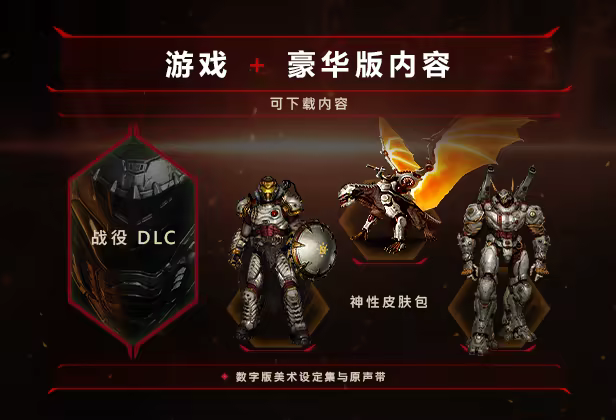 入手豪华版,奋起战斗,内容包括战役 DLC*、数字版美术设定集与原声带,还有神性皮肤包,内含毁灭战士、巨龙和亚特兰机甲的专用皮肤。