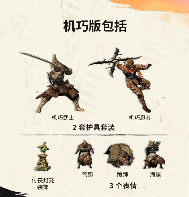 - 2 套完整装饰护具套装(机巧武士 + 机巧忍者)