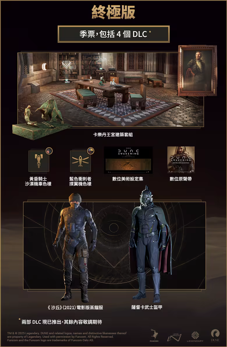 體驗一個極具電影感的壯大《沙丘》故事。在其中,你將會面對一個令人費解的問題:如果保羅.亞崔迪從未出生,這世界的命運會有何不同?你將會遇見如包括雷托公爵與菲德.羅薩等小說與電影中的角色,調查弗瑞曼人神秘的失蹤事件,並揭開你自己過去的謎團。加入亞崔迪或哈肯村陣營,並在提升自己地位的同時探索雙方的獨特故事。