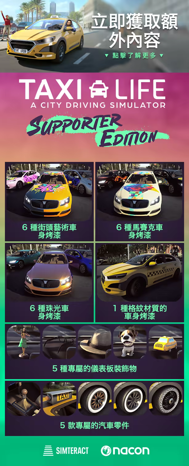 《Taxi Life》與最熱門的方向盤周邊產品及遊戲控制器相容。