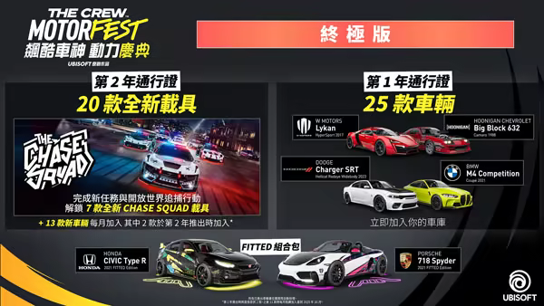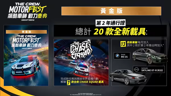 - 第 2 年通行證,內含 Chase Squad 體驗與多達 20 款額外載具(7 款獨家 Chase Squad 載具可供解鎖,外加每月推出的總計 13 款)。