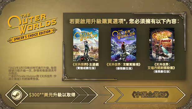已擁有《天外世界》與相關可下載內容「艾瑞丹諾斯謀殺案」與「戈爾貢險境」的Steam玩家可以降低過的售價升級為《天外世界:太空人之選版》。*若要啟用升級購買選項,玩家必須使用購買主遊戲與相關可下載內容時的相同Steam帳號登入,並選擇「Complete the Bundle(完整組合包)」購買選項。