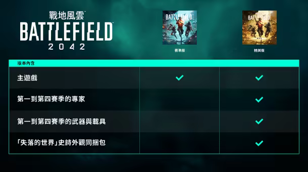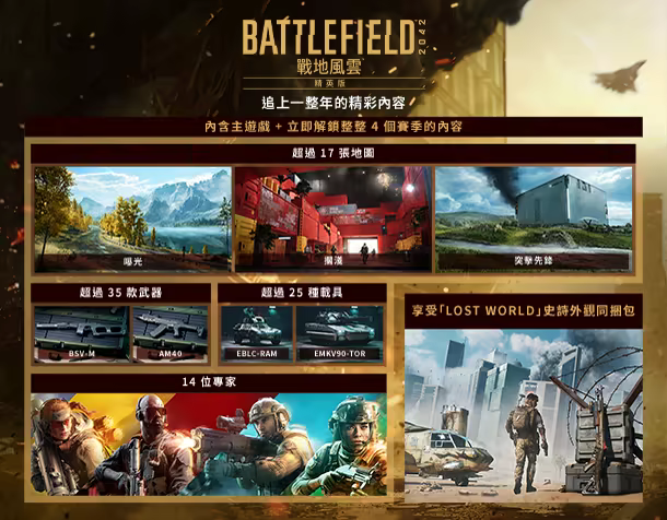 獲得《戰地風雲™ 2042》的最終版。《戰地風雲 2042》精英版擁有超值爆表的內容,包括: